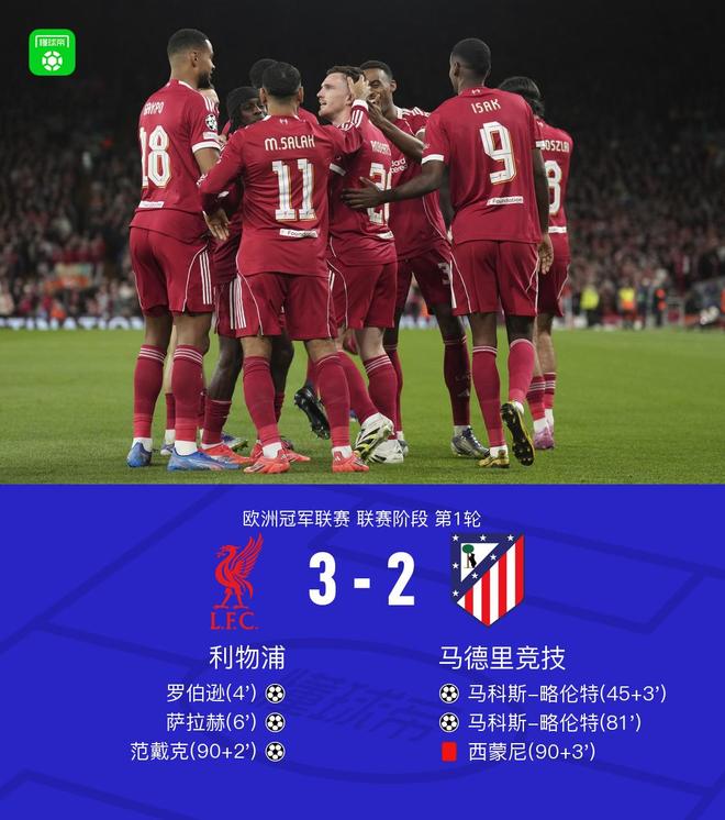 北京时间9月18日英超日报,欧洲冠军联赛联赛阶段第1轮展开较量,利物浦迎战马德里竞技。比赛伊始,萨拉赫送出助攻,罗伯逊破门为利物浦取得领先。随后不久,赫拉芬贝赫送出传球,萨拉赫攻入一球,将比分扩大。上半场补时阶段,拉斯帕多里助攻马科斯-略伦特扳回一城。第81分钟,马科斯-略伦特再度破门,帮助马德里竞技将比分追平。下半场补时第2分钟,索博斯洛伊送出助攻,范戴克头球破门,利物浦重获领先。比赛尾声,马德里竞技主教练西蒙尼被红牌罚下。最终全场比赛结束,利物浦3-2战胜马德里竞技。