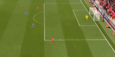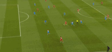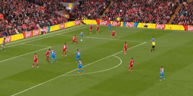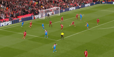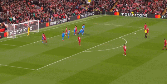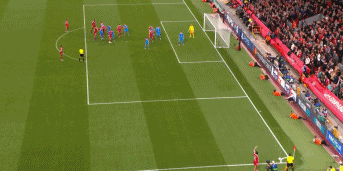第4分钟,萨拉赫主罚任意球弹在罗伯逊身上弹进球门,利物浦1-0!