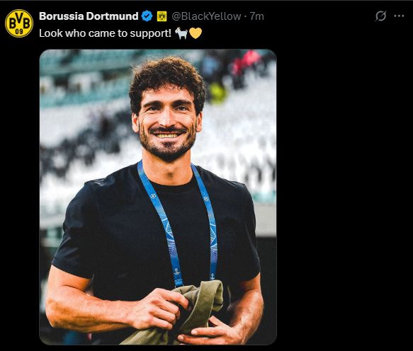 如今,胡梅尔斯首次以名宿的身份来到欧冠现场,为黄黑将士们加油助威。多特蒙德官方也转发了他依旧帅气的照片,还配上了一个“Goat”表情。