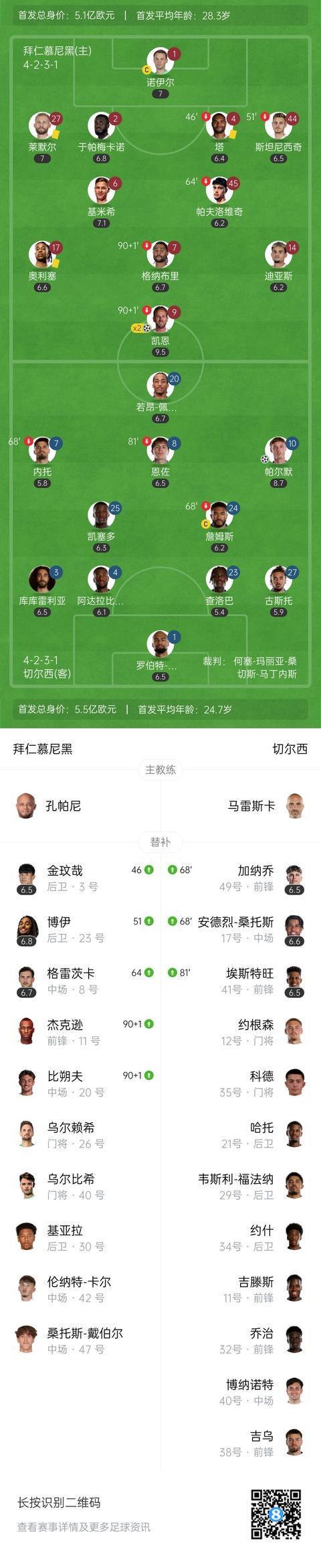 第63分钟,切尔西后场查洛巴分球古斯托,后者被逼抢回传失误送礼,凯恩得球禁区内右脚低射入网,拜仁3-1切尔西↓